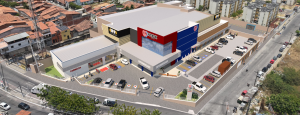 O empreendimento, localizado em Araturi, Caucaia, conta com estacionamento no subsolo, combinando supermercado, farmácia, academia e espaço pet em uma moderna estrutura de 5.000m² com arquitetura contemporânea.